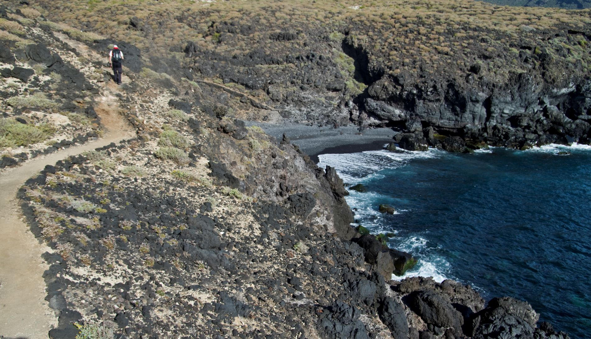 La senda que te ha llevado hasta esta playa vuelve a ascender por las laderas basálticas del barranco para llevarte de nuevo sobre el acantilado hasta la playa de La Viuda, punto final del recorrido.